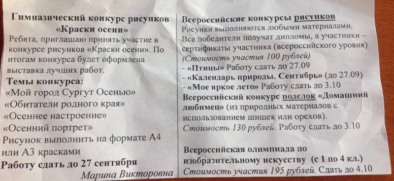 Натка писал(а): : 13.09.2014 19:59 Вот это супер!хорошая У нас "Б" класс. Меня учительница предупредила об олимпиаде и в дневнике сынуля написал "принести олимпиаду". правда качество копий не очень, спасибоМурлакатоша, сбросила цветной вариант на почту. А еще у нас есть электронная почта для всего класса, где каждый день классная рук. пишет какие задания выполнить по всем предметам и любые объявления для родителей. Интересно,неужели нельзя это сделать для всех классов? Нам ,кстати, до сих пор ничего вообще не задают на дом |