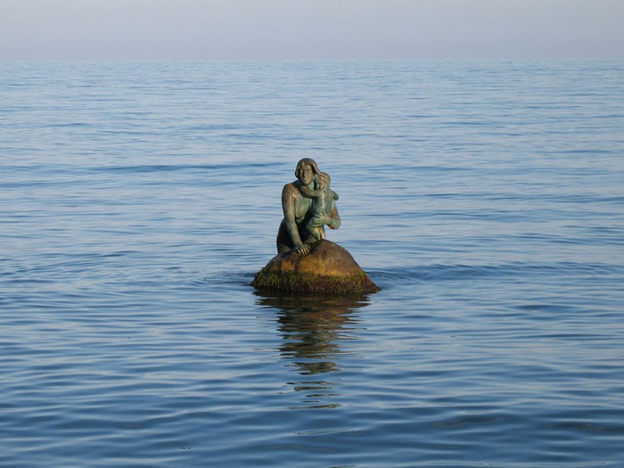 В Крыму есть памятник русалке с ребёнком Вот как гласит легенда: До сих пор памятник Русалке хранит в себе восхитительную по красоте легенду, повествующую о любви русалки к обычному человеку. Очень и очень давно в селении Мисхор жил очень скромный, но очень трудолюбивый человек с именем Абий-ака. Бала у него дочь – черноглазая красавица Арзы. Нежные щеки покрывал румянец словно бархатные персики, стан Арзы удивлял необыкновенной гибкостью и стройностью и был подобен виноградной лозе. Яркие губы были подобны цвету спелой вишни. Окружающие восхищались красотой Арзы. Но более всех засматривался на нее старый пройдоха Али-баба. Об этом старике ходили всякие слухи, якобы он то и дело крадет в деревне девушек и увозит их для продажи в турецкие гаремы города Стамбула. Время шло своим чередом, а красота девушки все более расцветала. Каждый день она приходила к любимому фонтану и часами сидела там, наблюдая за волнами и вспоминая о случайной встрече у этого фонтана с парнем из соседней деревни. И вот однажды к воротам дома девушки пришли от этого парня сваты… Радостно и очень громко отпраздновала деревушка Мисхор свадьбу прекрасной Арзы. Прошло совсем немного времени с этого события, а берег уже покрыли весенние сумерки. Теперь уже замужняя девушка Арзы, может быть уже в последний разок захотела увидеть свой фонтан и попрощаться с ним… В это время девушка даже и не думать не думала о том, что сейчас кто-то может наблюдать за ней. Мгновенно две сильнейшие руки схватили беспомощную девушку, закрыв ей рот и накинули на голову плащ. Злобные пираты под предводительством Али-бабы понесли свою добычу к лодкам… За Арзы была получена очень крупная сумма, а сама она оказалась в палатах самого султана. Вся деревня тосковала по Арзы и даже любимый ею фонтан зачах от тоски. Нахождение в неволе было просто невыносимо для Арзы. И даже рождение сына не могло освободить ее от тревоги. Не имея больше сил перенести все мучения, через год с момента неволи Арзы поднялась со своим ребенком на руках на султанский сераль. Достигнув вершины одной из угловых башен она камнем бросилась в воды Босфора. В этот же печальный вечер впервые у иссякшего фонтана Мисхорского берега появилась грустная русалка держа ребенка на руках. С тех пор единожды в год из спокойных глубин Босфора появлялась русалка с ребенком. Она подплывала к фонтану и очень долго смотрела на родную деревню. После чего, бесследно растворялась в морских волнах до следующего года…