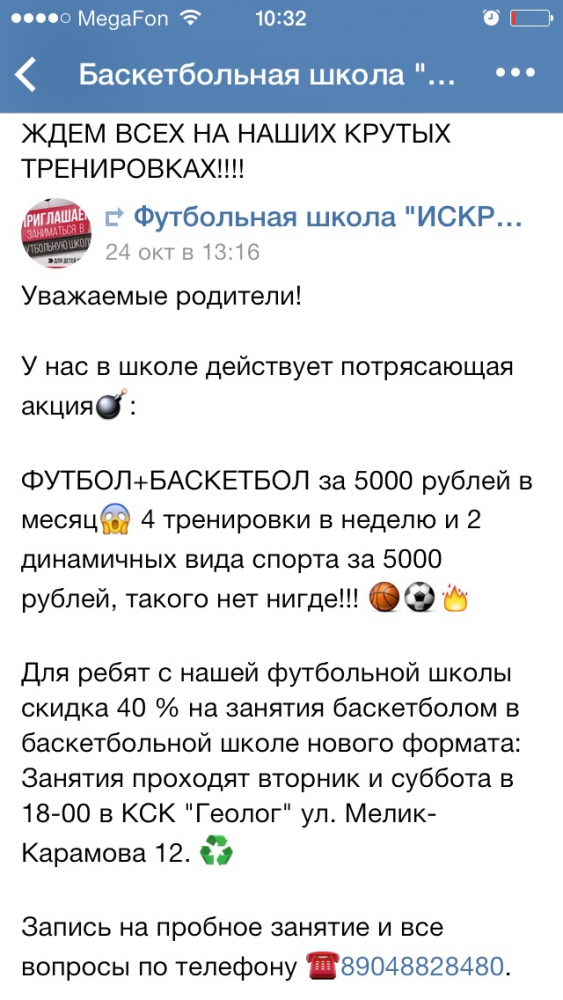 У нас в школе действует потрясающая акция: ФУТБОЛ+БАСКЕТБОЛ за 5000 рублей в месяц 4 тренировки в неделю и 2 динамичных вида спорта за 5000 рублей, такого нет нигде!!! Для ребят с нашей футбольной школы скидка 40 % КСК "Геолог" ул.Мелик-Карамова, 12 в игровом зале на 2 этаже. Ждем юных спортсменов на тренировку. Запись по телефону☎89048828480.