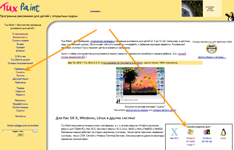 Можно купить диск, например для подарка Вот главная страница со ссылками Вложение: Вот прямой адрес страницы для скачивания: http://www.tuxpaint.org/download/windows/ Вот ссылка на последнюю версию 10МБ http://downloads.sourceforge.net/tuxpai ... taller.exe Вот ссылка на штампы 40МБ http://sourceforge.net/projects/tuxpain ... taller.exe |