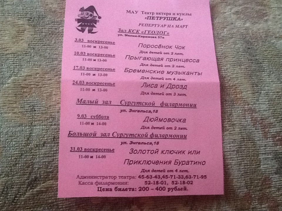 Сегодня были в Петрушке, дали репертуар на март. Кому интересно- выкладываю. Надеюсь не удалят как рекламу, т.к. ранее искала в инете, данной информации не нашла. Ведем детишек в театр!