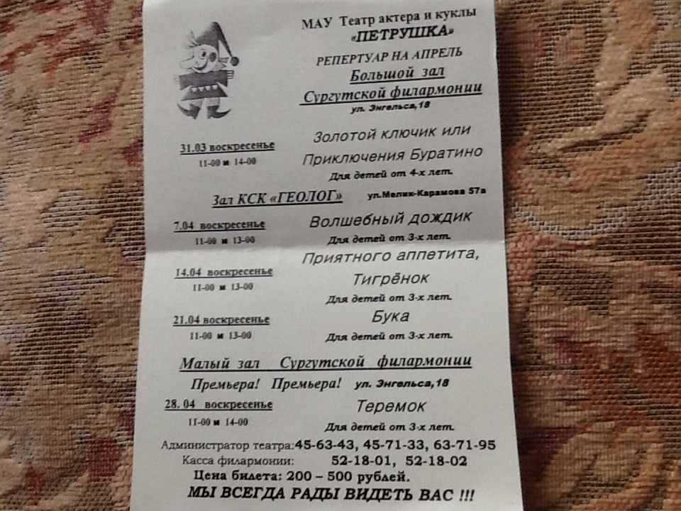 Что-то никто не выкладывает репертуар Петрушки на апрель. Мы любим театр, зовем всех ребятишек.
