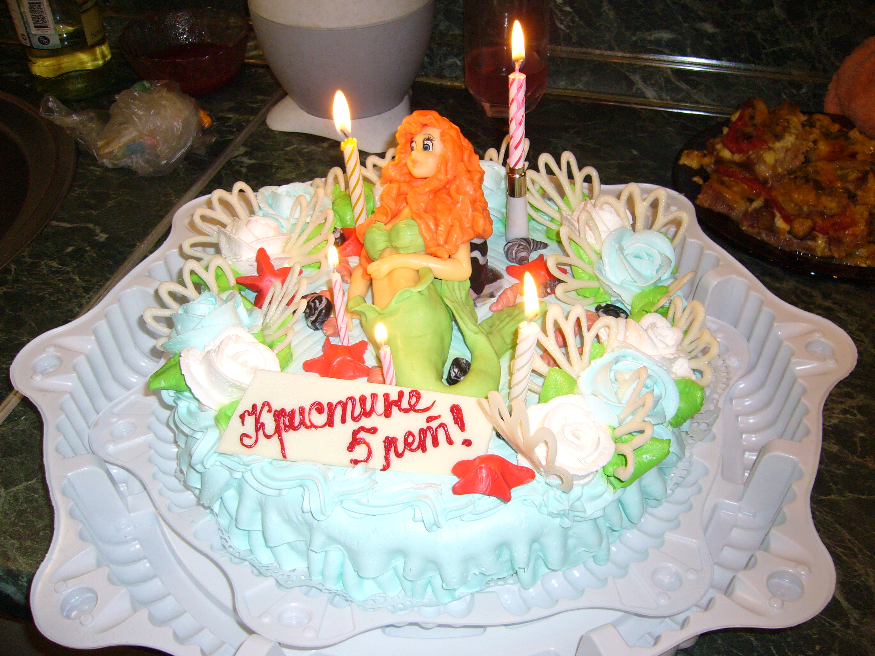 и отмечать 2 раза тоже не хочется. на 6 лет ужепланирую добраться до кафешки, а родню просто чаем с тортиком попоить . Торт на все праздники заказываю только в кешке ладкоешке, мне очень нравится, берутся делать любой заказ. Очень вкусно. На 5 лет заказывали 2 кг (получилось 3 как я помню) и сверху нам русалочку посадили (дочка по ней тащится). А подарили тоже русалочку куклу, она 1 м высотой, теперь валяется, незнаю где ей место найти ![]()