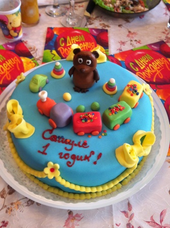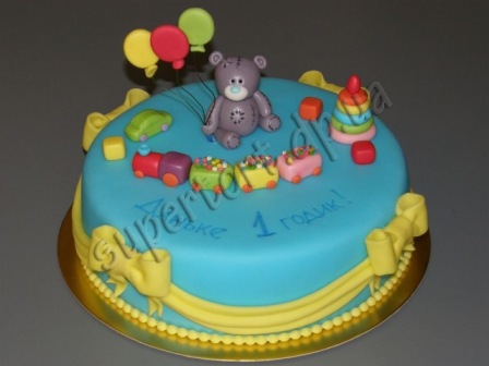 Начинку брали- бисквитные коржи, крем из взбитых сливок и фрукты (бананы, киви, персики). Торт очень вкусный получился, на 9 гостей съели почти сразу после застолья :) Оформление всем тоже очень понравилось. Также есть доставка -150 рублей, доставили вовремя. Вот фотография торта и в разрезе. А также фотография, которую приносила с собой как образец (из инета). Мишку с шариками я сама попросила заменить на винни-пуха, сын его любит.