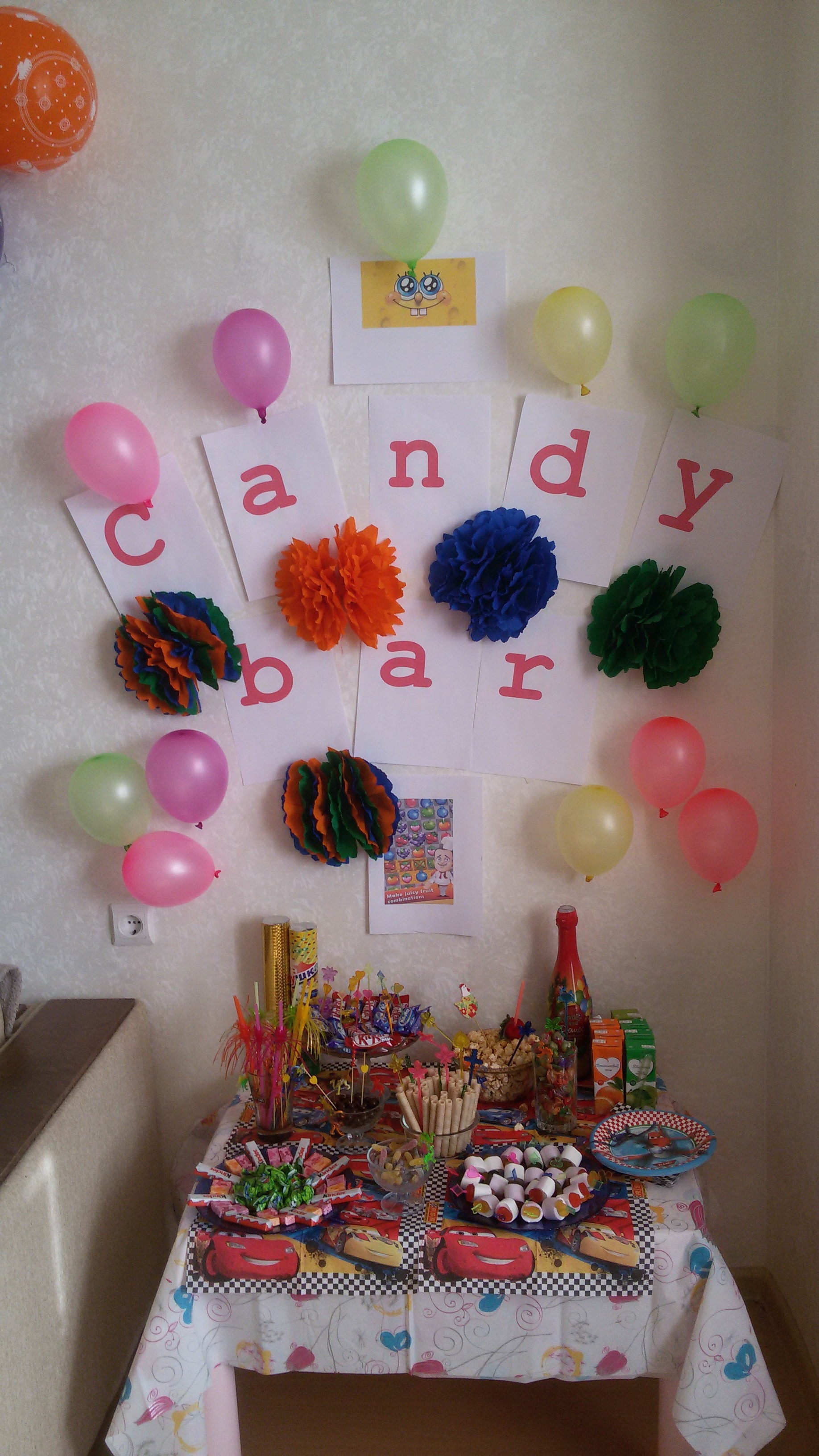 Сделала сама кенди бар, сразу оговорюсь, идея спонтанная, специально я не готовилась, купила вкусняшки что любят дети, так что строго не судите. Заказали Железного Человека у Милы, оооочень довольна, парень просто молодец 1 час - 2700 руб. Заказали хороший торт у Нелли ( в теме про нее уж писали) - 3500 руб. Гелевые шары - 55 руб. шт. Большие хлопушки - 250 руб. Детям кенди очень понравился :). все красиво украсили, веселились до 21.00, оптимальный вариант для будней, т.к. в таком возрасте ждать выходных очень сложно, а заведения в час пик ездить не удобно, да и многие проводят только до 20.00.