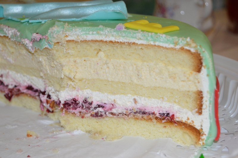 Начинка была "вишня под снегом". Очень нежный торт, в меру сладкий, светлый бисквит с верхней прослойкой суфле (похоже на птичье молоко, но нежнее) с ароматом ванили кажется, а нижняя прослойка -легкий крем с вишней. Для маленьких детей такой тортик как раз подходит.