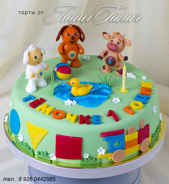 Нашла в интернете фото тортика с нашими любимыми персонажами и сказала, что если вдруг у мастера на получатся точно такие же фигурки, то лучше я закажу из предложенного у них на сайте, т.к. просто похожих зверят нам не надо, а надо точно таких же, на что мне ответили: "Не беспокойтесь, все сделаем". И сделали достаточно похоже Начинка была "вишня под снегом". Очень нежный торт, в меру сладкий, светлый бисквит с верхней прослойкой суфле (похоже на птичье молоко, но нежнее) с ароматом ванили кажется, а нижняя прослойка -легкий крем с вишней. Для маленьких детей такой тортик как раз подходит.