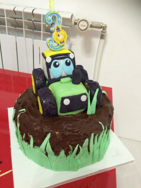 Мы остались очень довольными. Торт был вкуснейшим, хоть и торты я вообще не люблю. Бисквиты-шоколадные и фисташковые. Начинка-йогуртовая. Трактор- пирожное "картошка" обтянутый мастикой. Прикладываю фото торта из инета... и фото нашего торта