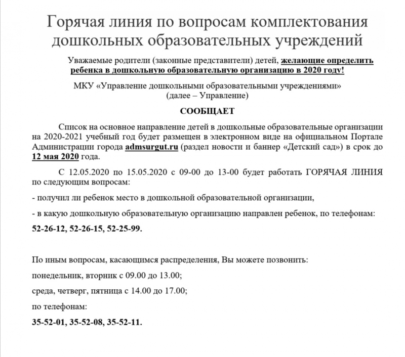 Раздел сайта "Всё про садики (УДОУ)" с самыми свежими новостями, ПРОСТО КУЧА ПОЛЕЗНОЙ ИНФОРМАЦИИ! https://detkino.ru/roditelskaya/vse-pro-sadiki-udou Как расшифровать ИКР: xx/dd-mm-yy/n Где xx - каким по счету зашел в кабинет dd-mm-yy - это день-месяц-год постановки на учет n - от 1 до 3, указывает на наличие льготы, 1 внеочередники, 2 - первоочередники, 3 - общая ВНИМАНИЕ! Изменился график работы отдела по работе с населением. Горячая линия по вопросам комплектования образовательных учреждений 8 (3462) 35-52-01, 35-52-08, 35-52-11, 23-01-16 понедельник, вторник, с 9-00 до 13-00; среда, четверг, пятница с 14-00 до 17-00. Приём населения осуществляется по адресу: ул. Дзержинского, 4/1 График приёма: Понедельник с 14:00 до 18:00 Четверг с 9:00 до 13:00 |