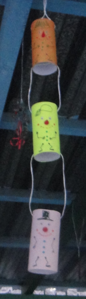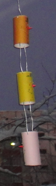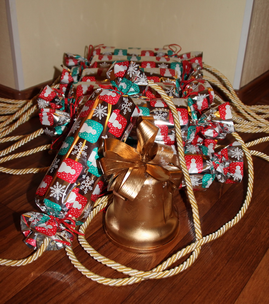 Гирлянда для предновогоднего украшения детской беседки. Внутри "конфет" пластмассовые циллиндрические коробочки, . В центре композиции - покрытый золотой краской колокольчик - упаковка от известных всеми конфет (покрытых кокосовой стружкой).