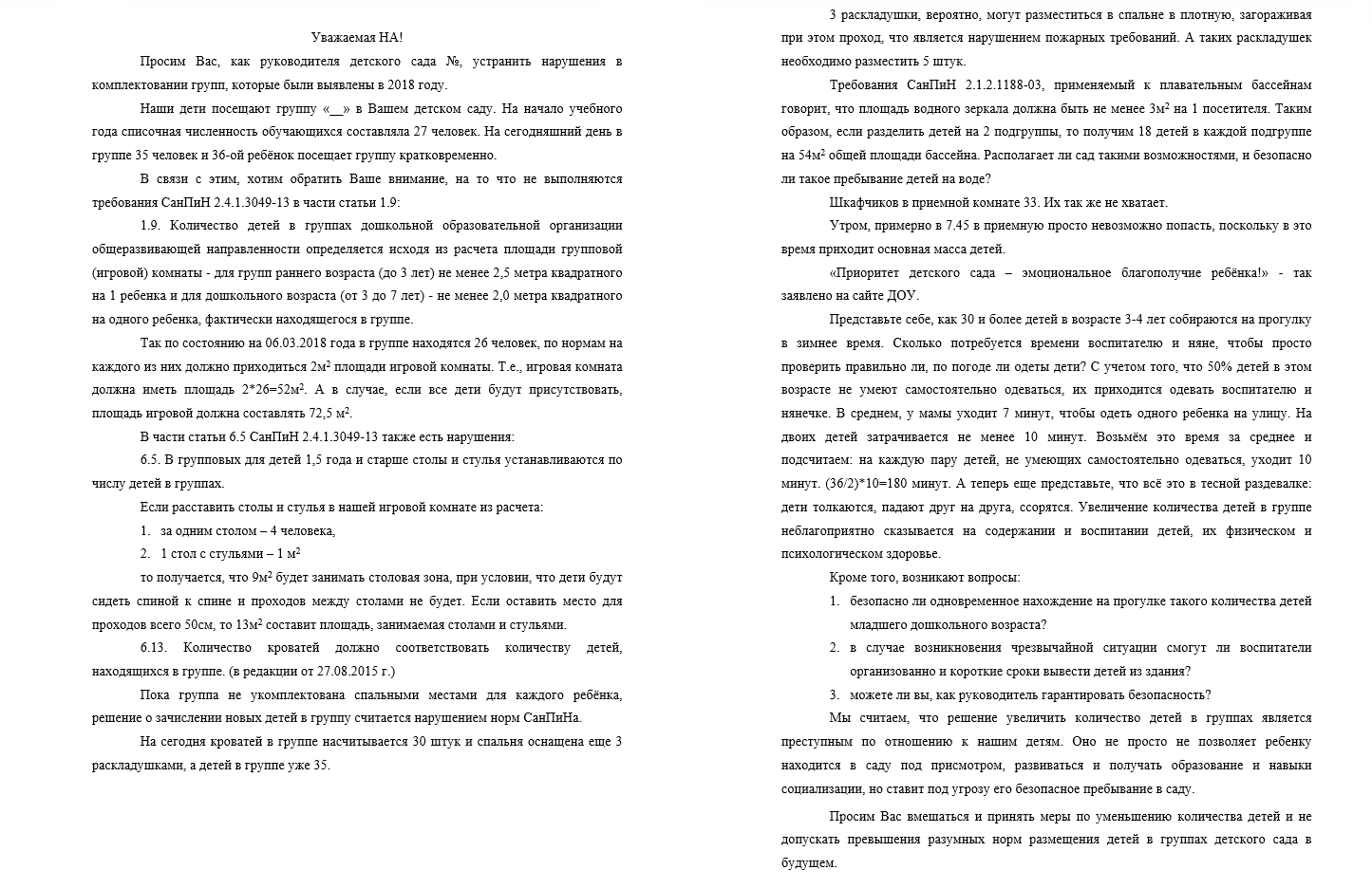 Зануда писал(а): ... Главное помнить, что никто, никому ничем не обязан. Тогда и жить как то легче. И надо как то реально смотреть на вещи. Нет? Вообще-то, обязан - конституцию почитайте.. Я, например, частным садам не доверяю: совершенно нет там никакого контроля и вот там-то никто никому ни чем не обязан, и это за такие-то бабища.. Имела опыт: отдала ребенка в ЧДС, а они помещения на ночь как хостел сдавали, в другом саду когда пришли - были педагоги, а потом вообще не пойми кого взяли на работу: говорит моему плачущему ребенку "не плачь, а то придёт дядя милиционер с собакой и заберет тебя". Сервис у нас в Сургуте больше похож на выкачивание денег с состоятельных родителей, чем на сервис. А зарплата не у всех позволяет платить зарплату еще кому-то. Считаю, правильным опубликовать текст письма, направленного мной заведующей нашего детского сада. Опять же повторюсь: понимаю, что не в её полномочиях пересмотреть бюджетирование и муниципальный заказ: нам просто необходимо выходить на округ с этим - это просто один из шагов. Мне нужны соратники - пишите в личку. Будем писать групповое письмо. Под этим уже подписались все родители нашей группы (кроме тех, что болеют). Теперь буду выходить на группы садика.