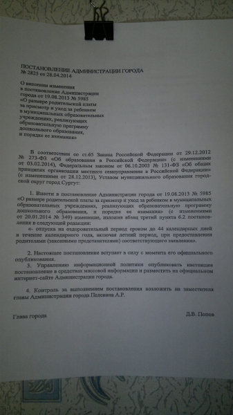 28 апреля 2014 года постановлением Администрации города № 2825 внесены изменения в постановление Администрации города от 19.08.2013 № 5985 «О размере родительской платы за присмотр и уход за ребенком в муниципальных образовательных учреждениях, реализующих образовательную программу дошкольного образования, и порядке ее взимания».