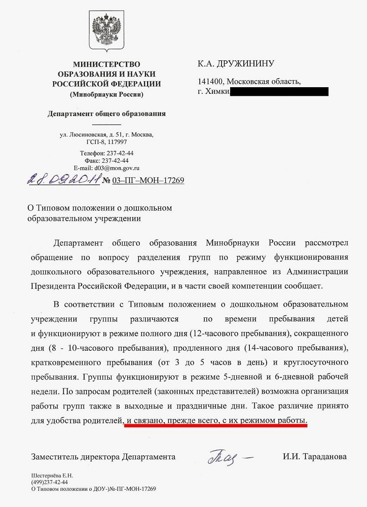 Все мы прекрасно понимаем, что детский сад как социальная служба придуман не только (и не столько) для того, чтобы детей воспитывали профессиональные педагоги, а для того, чтобы мамы, выйдя из отпуска по уходу за ребенком, смогли снова выйти на работу. Весь вопрос в том, понимают ли это чиновники. Лично у меня в этом очень большие сомнения, потому что у нас есть города, в которых родителям, кровь из носу нуждающихся в том чтобы ребенок ходил в группу полного дня, без зазрения совести предлагают путевку в группу кратковременного пребывания, а потом на суде объясняют, что они таким образом обеспечивают общедоступность образования, а трудовые права родителей их совершенно не волнуют. Не волнуют совершенно напрасно, потому что волновать должны. По закону. По свидетельству Министерства образования и науки РФ (письмо № 03-ПГ-МОН-17269 от 28.09.2011) различные режимы пребывания в группах ДОУ приняты для удобства родителей и связаны, прежде всего, с их режимом работы: