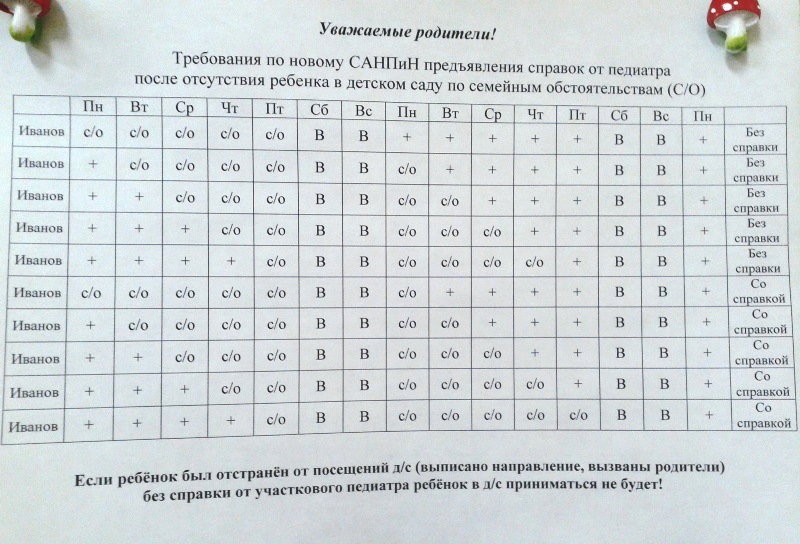 В садике "Гусельки" (туда ходит моя дочь в ГКП) уже давно висит сия таблица, всё никак руки не доходили выложить. Действительно, по новым санитарным нормам можно не ходить в садик до пяти дней без справки