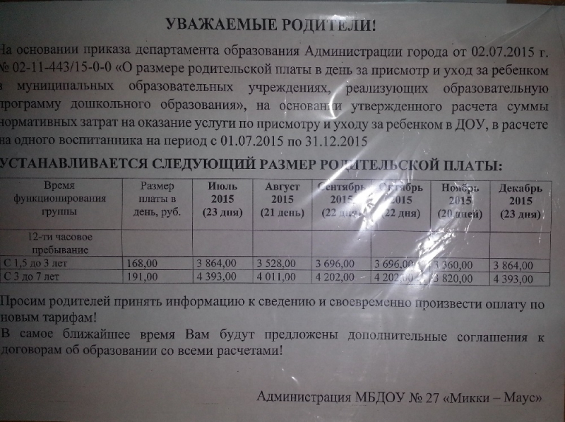 MaLiNoK писал(а): :04 июл 2015, 10:11 №922 У нас группа до 3 лет. Обычная плата 2885 р, а для с/о и платного отпуска расчёт идёт по 2233 р/мес. Спасибо. Я спросила к тому, что до сентября уже все оплатила, т.к мы до этого периода в отпуске. У нас до этого оплата была 1990 рублей. Если повышается оплата за сад, наверно и оплата за отсутствие ребенка тоже повысится? Самое интересное, что оплата получается приличная, а качество низкое, т.к в группах дети как селедки в бочке набиты и не хватает на всех ни кроваток ни шкафов