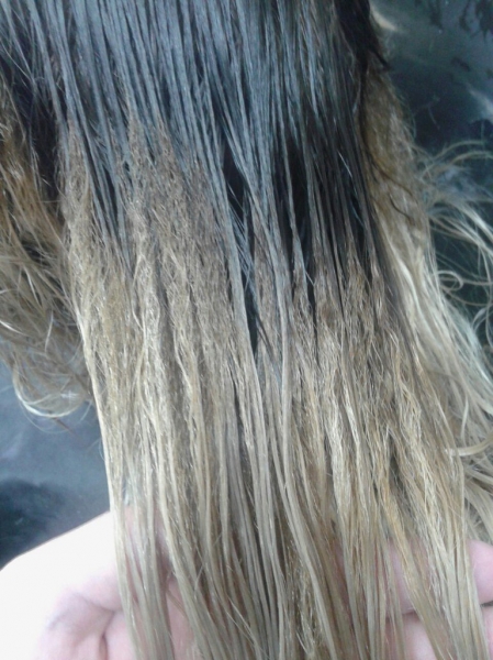 Вложение: и это ужас мочалка волосы отросли (8 месяцев прошло) девушка раньше осветляла, теперь вынуждена красить типа омбре, потому как эту мочалку осветлять нельзя, могут отломаться а волосы до пояса |