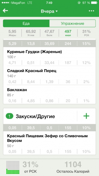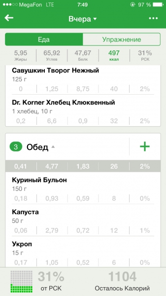 Спортом занималась всегда - восемь лет профессионально, потом из-за мед противопоказаний уже для себя фитнес, плюс активный образ жизни- сноуборд и лыжи, в том числе горные, очень хорошо катаюсь на коньках и соотв.на роликах и тп. После первых родов продолжала занятия в зале, а сейчас с двумя детьми сложновато, младшему только 9 месяцев Но спасибо спортивному прошлому, ничего не обвисло, единственное, кожа на животе, если наклониться или когда пресс качаю, в мелкую полосочку становится так что я в раздетом виде не наклоняюсь может, само пройдет , но эластичность уже не та Про скрины Это например У меня закуски редко прописаны как закуски, чаще всего это остатки не влезшего завтрака или обеда, я их отдельно не записываю, вычитать хлопотно, ем то готовые блюда Если надо, разверну страницу, все вместе не влазит.