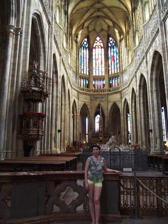 Купили билет, включающий Злату улочку, старый Королевский дворец, базилику Св. Иржи и собор Св. Вита. Можно взять билет, включающий и другие достопримечательности, но мы решили, что нам хватит. На Златой уличке раньше селились ювелиры, сохранились их крошечные домики. Но самое интересное там – Оборонный коридор с коллекцией доспехов, куда можно подняться через башню. Желающим там предлагают пострелять в цель из арбалета. Муж попробовал и даже, в отличие от многих, попал. От Королевского дворца, по сути, остались только стены, интерьеры отсутствуют, поэтому вид у него какой-то бледный. Понравилась базилика Св. Иржи, древнейший сохранившийся романский храм Праги. Базилика заложена князем Вратиславом (915-921). Ну и конечно, собор Св. Вита поражает величием и масштабом.