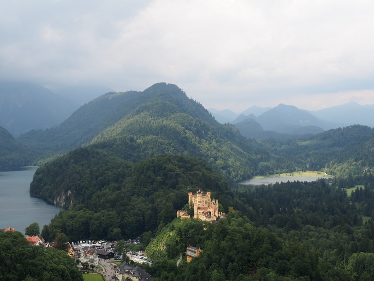 Очередь к кассам – в прямом смысле километровая, если не больше. Но у нас забронированные билетики, и мы гордо плывем к кассе «Rezervations only», к которой стоят три человека. Время экскурсии у нас 13.00, а мы приехали примерно в 11.30. Прошлись по сувенирным магазинчикам, осмотрели снаружи второй замок – Хоеншвангау, потом на автобусе (1,2 евро) поднялись в гору. Вложение: Вид от Нойшванштайна на долину Швангау