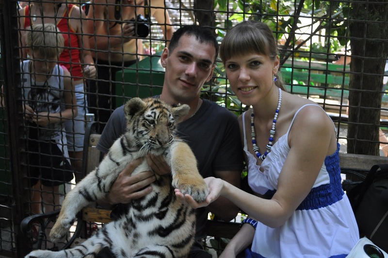 В зоопарке с тигрятами))))даже лапы у него очень тяжелые0))