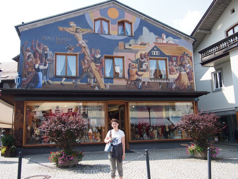15 августа. Пошли в центр Обеаммергау, осматривать люфтмалерай – росписи, сделанные по сырой штукатурке на фасадах домов. В середине 18в. здесь родился художник Франц Цвинк, ставший впоследствии знаменитым тем, что необычайно красиво расписал фасады домов. На фресках изображены портреты святых, библейские сюжеты, сюжеты из сказок, а также то, что имеет отношение к упомянутым выше постановкам.
