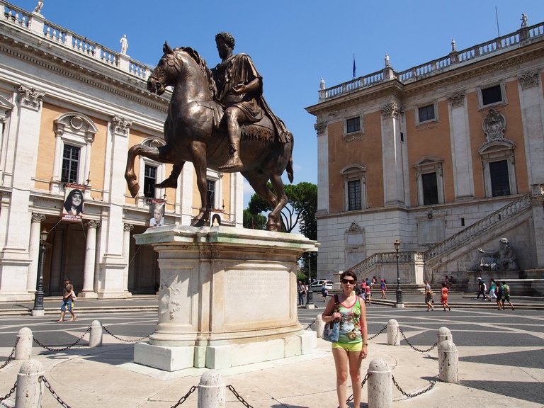 Мне больше Капитолийский холм приглянулся. Дошли туда через римские форумы, поднялись. На Капитолийском холме расположено задние магистрата Рима, рядом с ним – копия известной статуи волчицы, кормящей Ромула и Рема. Перед магистратом – конная статуя Марка Аврелия. Вложение: Капитолийский холм