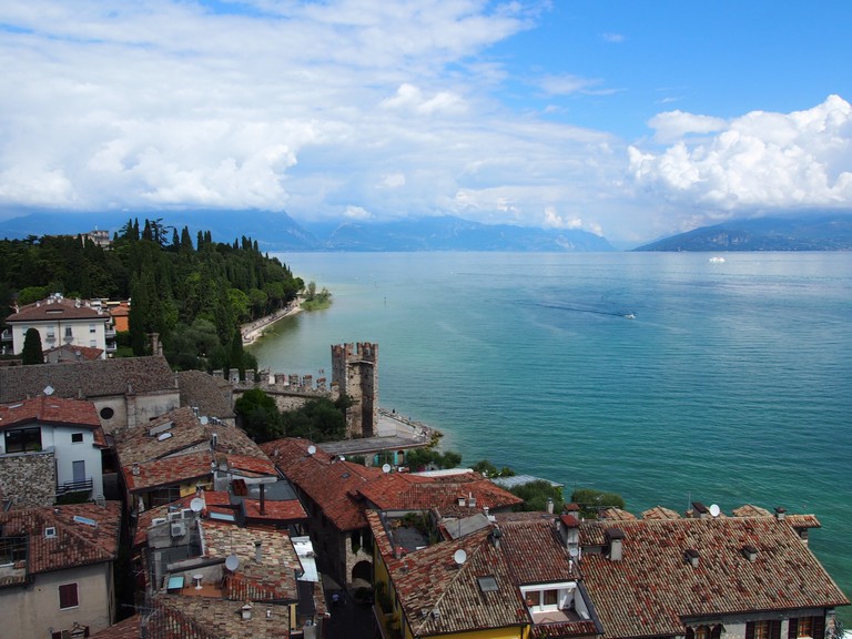 Замок Скалигеров в понедельник был закрыт, вернулись к нему во вторник (это уже 27 августа). Он хорошо сохранился, хотя датируется XIII веком. Некогда замок служил военным портом веронской флотилии. Раньше вход в замок осуществлялся через подъёмный мост, сохранившийся до настоящего времени. Теперь вход и въезд в город осуществляется через постоянный мост, переброшенный через протоку, отделяющую старый город от его районов на мысу. Пристроенная к замку и полностью окружённая стенами гавань представляет собой уникальное для Европы сооружение. Вложение: Вид на Сирмионе и озеро Гарда с башни замка Скалигеров