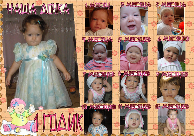 Красивые рамочки! Доченька ещё лучше! Я вот тоже до годика дочки все оформляла, а потом сынок родился и не до этого совсем стало - да и фоток у него меньше на порядок . Теперь вот жалею.А ты в какой программе делаешь? Вопрос. Девочки, а как вы вообще храните детские фотки: распечатываете или так в компе все по месяцам сложено - какая у вас система?