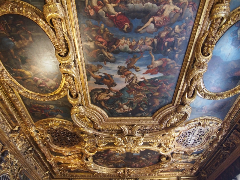 В число секретный помещений дворца входят, помимо тюрем и зала Совета Десяти, зал Совета Трех (инквизиции), зал пыток и зал исполнения приговоров (эшафот). Экскурсия очень интересная, однако людям, страдающим клаустрофобией, она противопоказана, т.к. все помещения узкие, много приходится ходить по лестницам. Кроме того, в помещениях очень душно и тяжело дышать. После экскурсии можно самостоятельно продолжить осмотр помещений дворца, доступных для общего посещения. В залах собрано огромное количество произведения искусства – статуи, картины, мозаики, да и сами они потрясающе красивы – резные потолки, росписи на стенах… Вложение: Потолок во Дворце Дожей