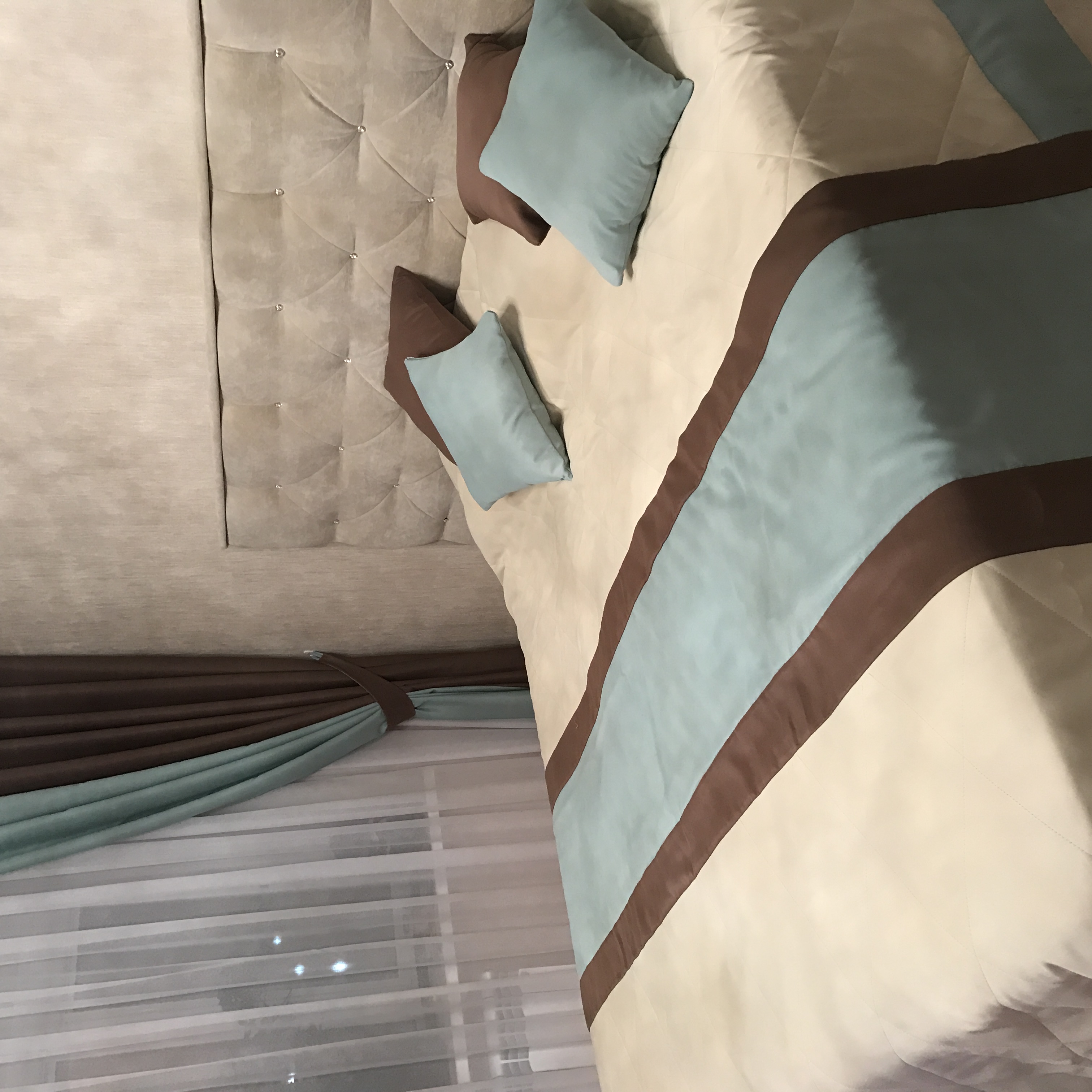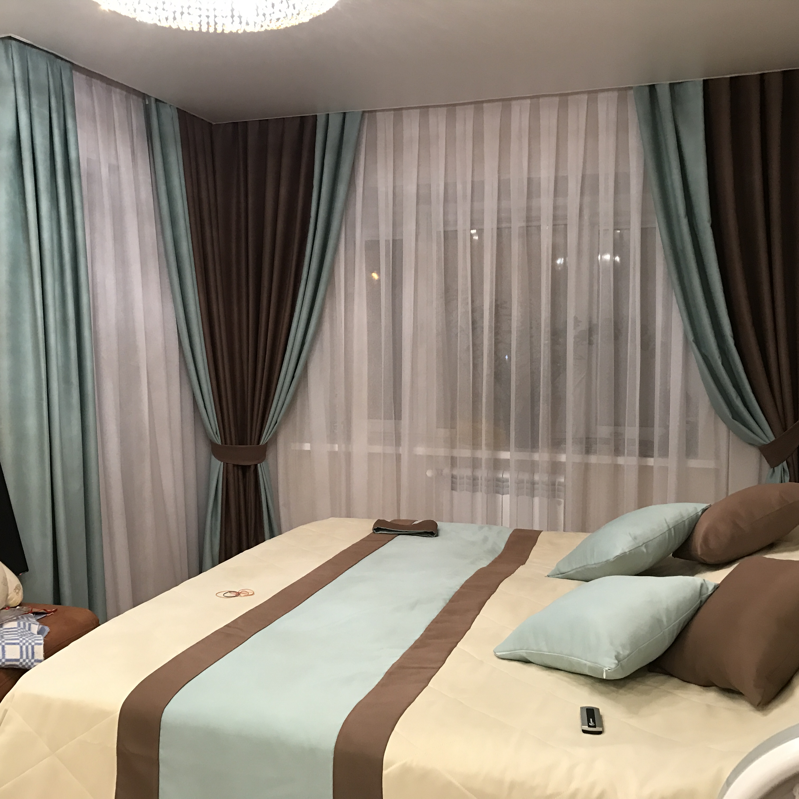 с учётом того что сама не знала чего хочу. Так что и я рекомендую обращаться к ней. Заказывала я шторы, тюль, покрывало на кровать и подушки в спальню и шторы, тюль, чехлы на стулья и подушки на диван в кухню-гостиную. Фотки пока могу выложить спальни. Чуть позже гостиную с кухней выложу, так как надо собрать всю новогоднюю атрибутику