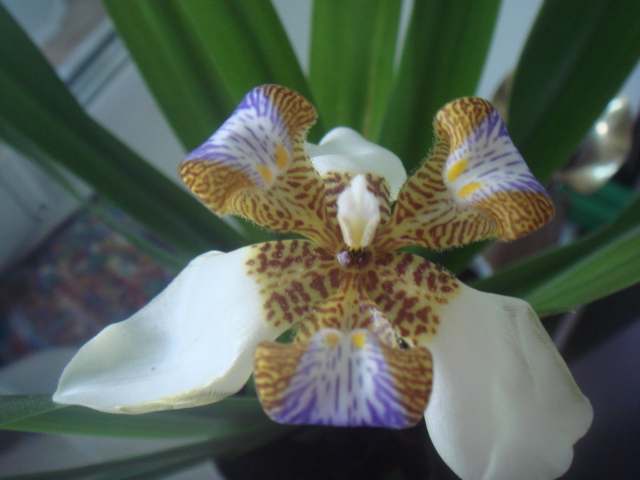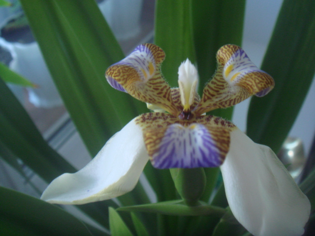 Наверное все видели во многих учереждениях да и на подоконниках у многих растет веер зеленых листьев. Неомарика шагающий ирис или как его еще называют апостольский. Достаточно тугая растень, любит нарастить листья без намека на цветение. Но росточки приживаются хорошо.Почему шагающий.. потому что когда отцветает стрелка наклоняется ищет место на земле и пускает корни. Любит переувлажнение и для закладки бутона - прохладу, для чего я его и выставила на балкон и не заносила даже приустойчивом 0 минус 2. Цветет недолго,, всего сутки. Но цветок- оторваться не возможно.
