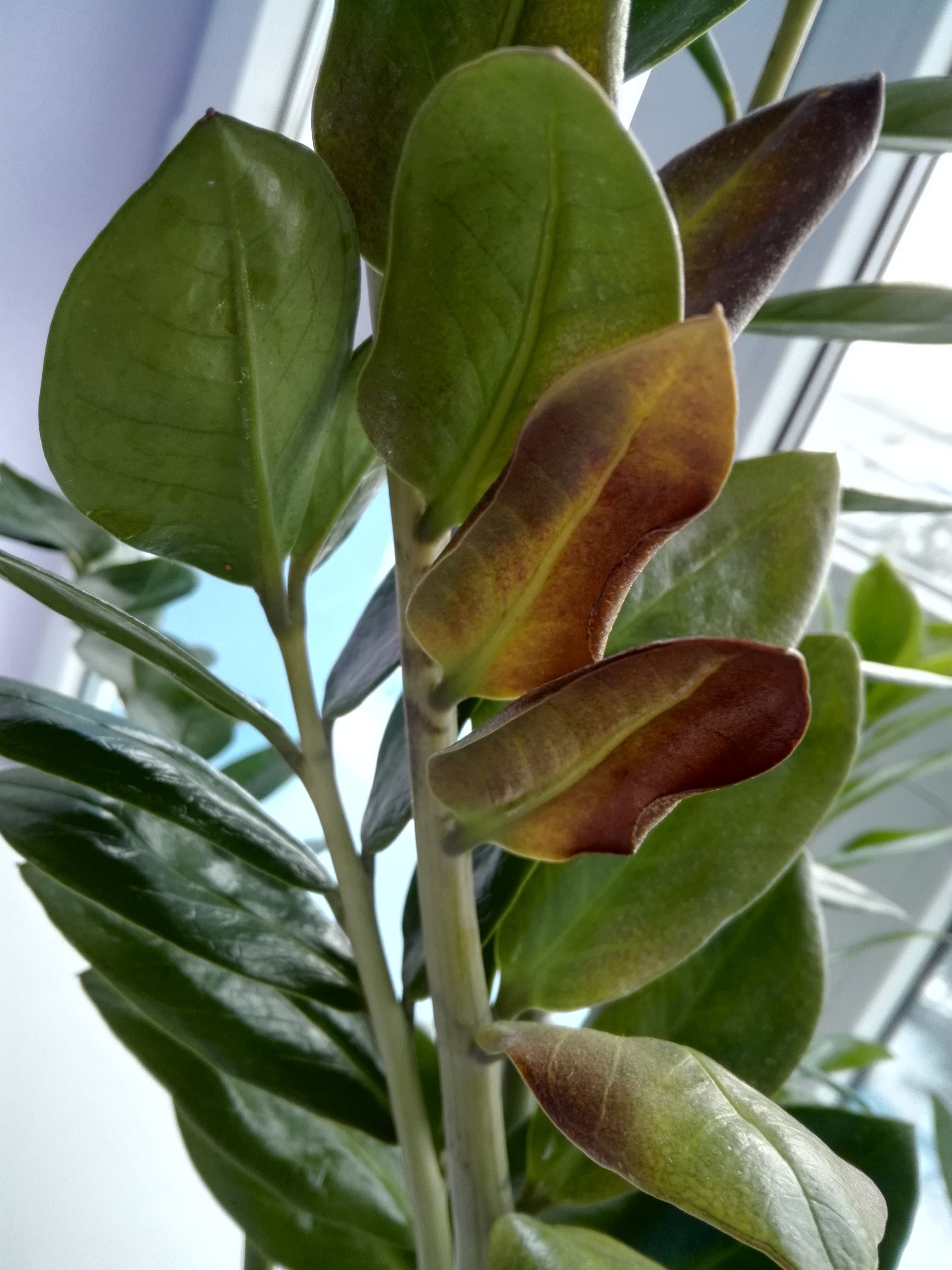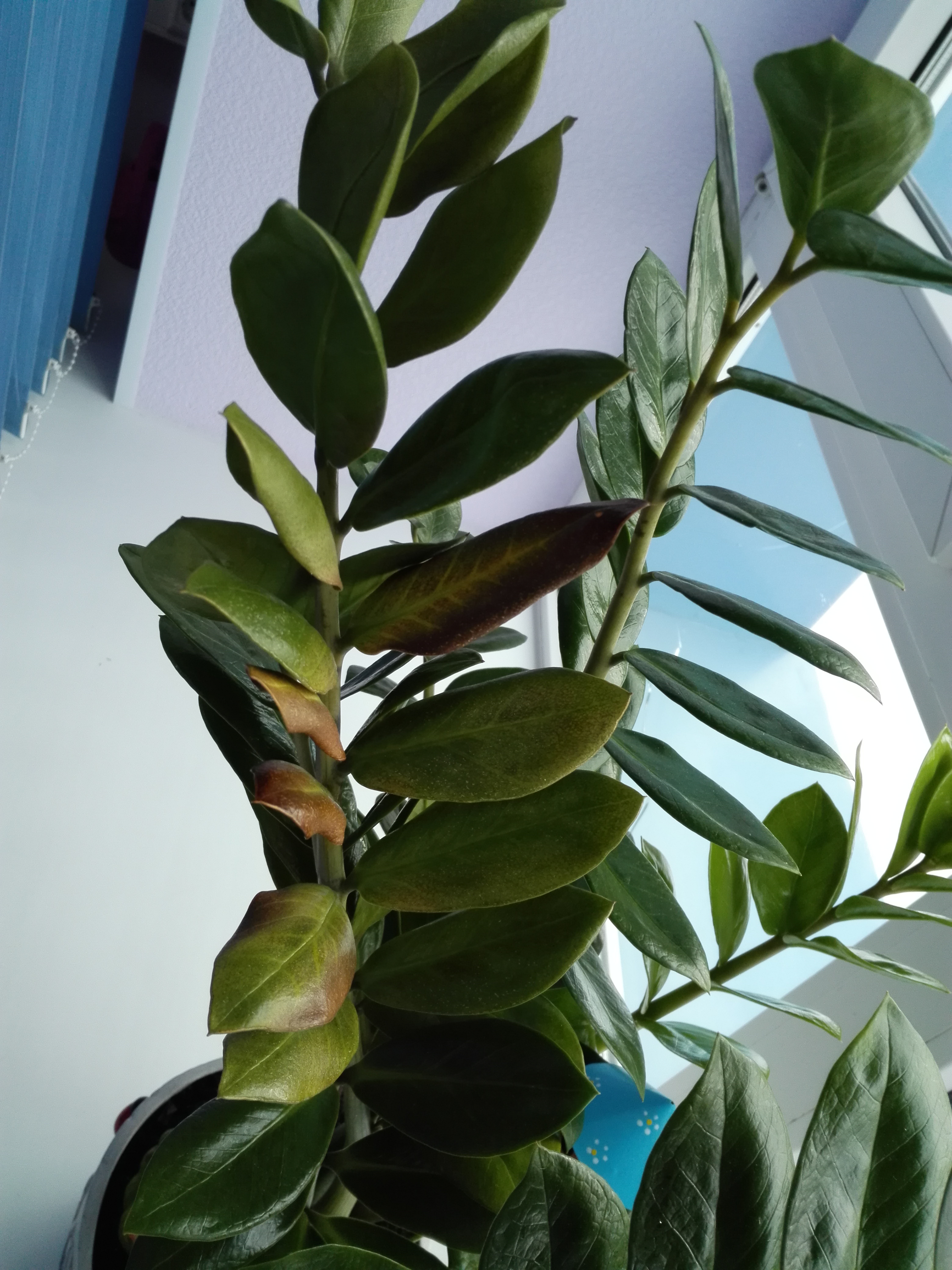 Девочки у меня тоже вопрос как раз по замиокулькасу созрел, у меня что-то тоже желтеть начал в одном горшке один стебель и в другом прямо один скрутился, я конечно грешу на солнце, стоит на подоконнике на работе, ибо больше некуда там поставить, знаю нельзя на солнце держать, но тем не менее стоит так уже почти 2 года, и чувствовал себя нормально, а тут вот ни с того, ни с сего вдруг желтеть стал, и еще какие-то бороздки обнаружила на одном стебле, меня смущают что-то они, и смотрю на нескольких стеблях как пятна темные, но думаю это не критично, т.к. у кого на работе у нас стоит замио у многих так, и читала сегодня вроде говорят от того, что трогаешь еще новые зеленые листики мол может быть такое )))