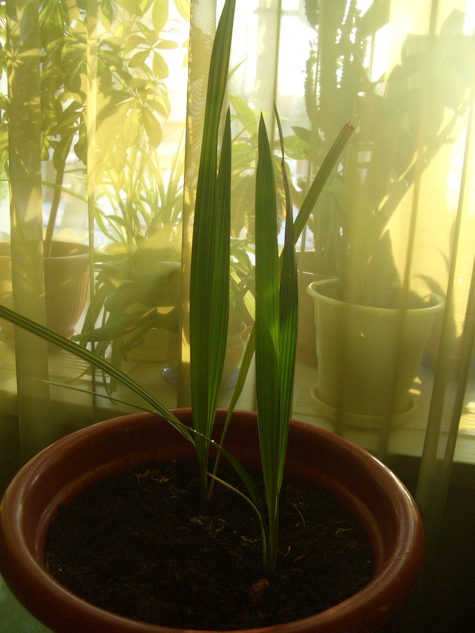 Я пальму дома вырастила, ствол см 40-50 был и такой же волосатый как на юге, но вот горщок у меня побольше вашего был. И я бы финики еще рассадила в разные горшки, а то смотрю у вас там два в одном