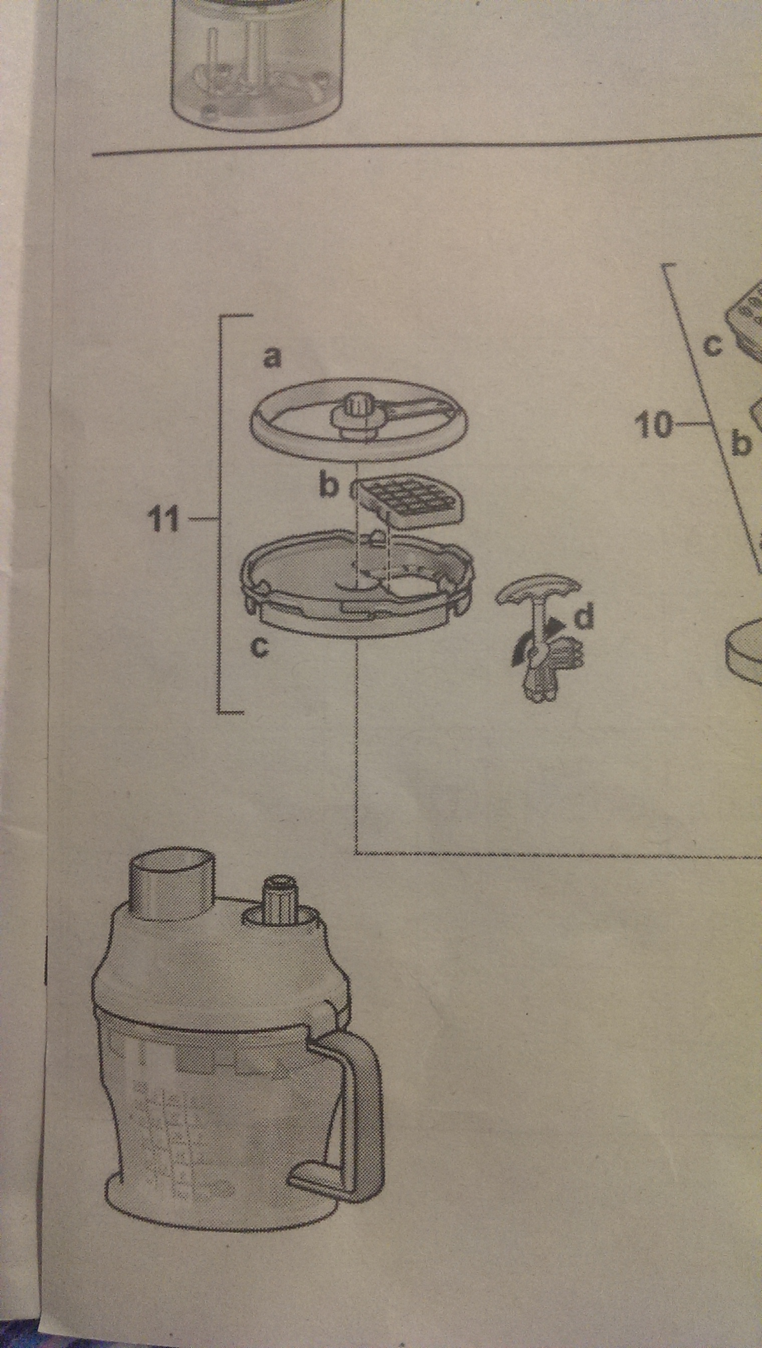 Дай Бог буду жива, к выходным кубиками попробую, так глянула, вроде просто надо вставить решетку на пластик.диск и поместить в большую емкость, инструкцию не читала, просто ощупала все дополнительных деталей для этой манипуляции не нашлаТакс, нашла, думала что за коряга , на рисунке это d, оказывается это приблуда для чистки шинковок. Сборка на кубики 11, в принципе нормально, ребенок уже попробовал , главное пальцы не отрезать ![]() Короче, посмотрела как твой бош кубикс на кубики собирается, у меня похоже также .Там тоже есть защелки, с небольшим усилием они защелкнулись, размер 9мм, как-то много вроде, ладно ближе к выходным порублю ![]()