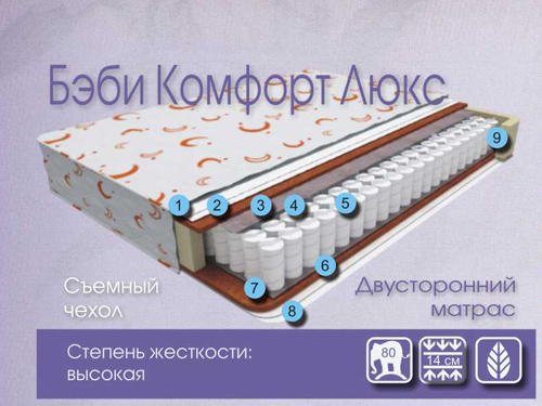 Характеристики: Упругий матрас, в основе которого - независимый пружинный блок, повторяющий контуры тела и обеспечивающий правильное распределение нагрузки веса тела на поверхность матраса. Кокосовое волокно обеспечивает долговечность матраса. Матрас рекомендуется детям от 4 лет при первых признаках нарушений осанки. 1 Чехол из стеганной бязи или хлопковый жаккард стеганный Воздухопроницаемый, высокие гигиенические свойства, не вызывает аллергии. 2, 8 Ватин. Обеспечивает воздухопроницаемость, хорошо впитывает влагу и испаряет ее, оставаясь сухим и свежим. 2 слоя. 3, 7 Кокосовая койра. Придает матрасу жесткость. Обеспечивает водонепроницаемость, упругость и долговечность. Толщина 10 мм. 4, 6 Термовойлок. Служит изолирующим слоем - предохраняет пружины от изнашивания, обеспечивает долговечность. 5 Блок независимых пружин. Повторяет контуры тела, благодаря чему происходит точечное распределение нагрузки. Высота 100 мм. 9 Пенополиуретан по периметру. Используется для усиления периметра матраса во избежание его деформации во время эксплуатации.