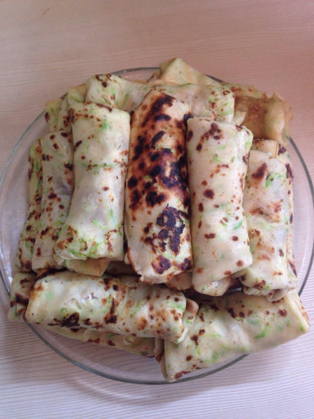 Кабачковые блинчики. Развернуть/свернутьВложение: Вкусные кабачковые блинчики можно приготовить на завтрак или на ужин. Блинчики получаются очень нежными и мягкими. Для начинки можно использовать сыр или творог, будет очень вкусно. Для приготовления кабачковых блинчиков понадобится: 1 кабачок; 1 яйцо; 1 стакан молока; 2/3 стакана муки; 1/2 ч. л. соли; черный молотый перец; растительное масло. Для начинки: 2 ст. л. майонеза; 2 ст. л. сметаны; 3 зубчика чеснока; свежий укроп. Блинная сковорода диаметром 20 см. Из указанного количества ингредиентов у меня получилось 7 блинчиков. Кабачок вымыть, очистить и натереть на мелкой терке. Добавит яйцо, соль и перец, перемешать. Влить молоко, перемешать. Постепенно всыпать муку. Должно получиться негустое тесто для блинов. Если тесто получится слишком густым, блины будут толстыми и сломаются при сворачивании. Жарить кабачковые блинчики на разогретой сковороде с добавлением небольшого количества растительного масла на среднем огне. Обжаривать с обеих сторон до золотистого цвета. Для начинки смешать майонез, сметану, мелко нарезанный укроп и пропущенный через пресс чеснок. Смазать блинчики тонким слоем и свернуть. Вкусные и ароматные кабачковые блинчики готовы. Приятного аппетита, радуйте своих близких! cвернуть наверх