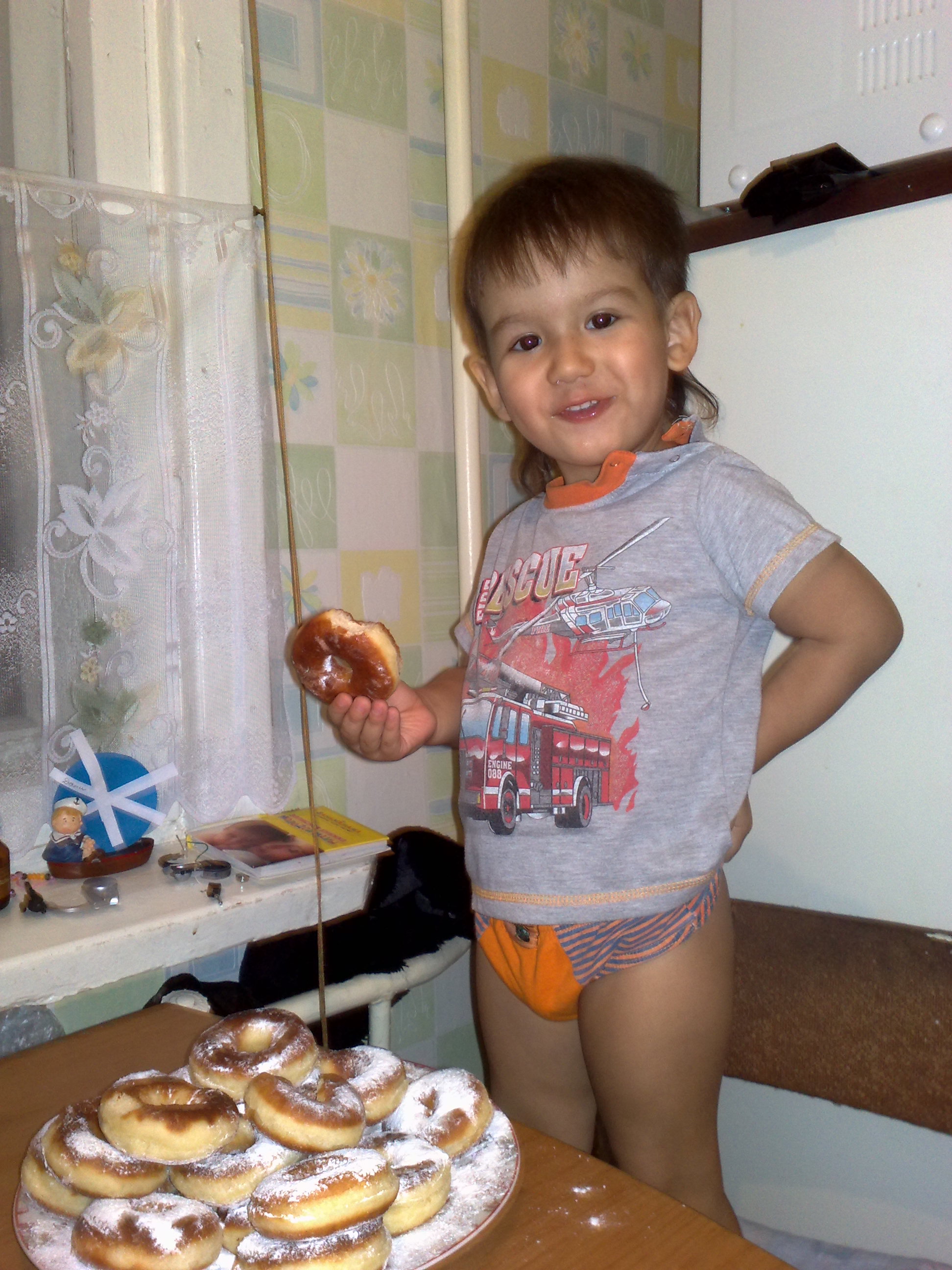 В тему пончиков,в стакане молока разведем столовую ложку сахара и 2 ч.л дрожжей,оставить до появления шапочки+3 желтка,стол.ложку водки,коньяка,30 г слив масла,муку до получения мягкого теста.Оставить до поднятия,раскатать,вырезать кружочки с дырочками,оставить до расстойки на 10-20 минут.Жарить в масле и обильно посыпать сахарной пудрой.Фото только такое
