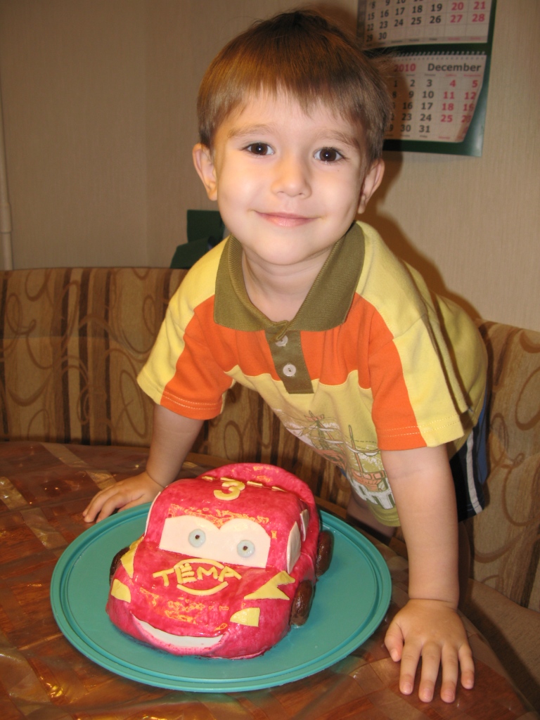 Мой первый автомобиль. Молния Маккуин (по крайней мере старалась изобразить именно его). Правда страшненький какой то получился.Муж раскритиковал, говорит не похож. А сыну понравился, сразу узнал в торте любимого героя.