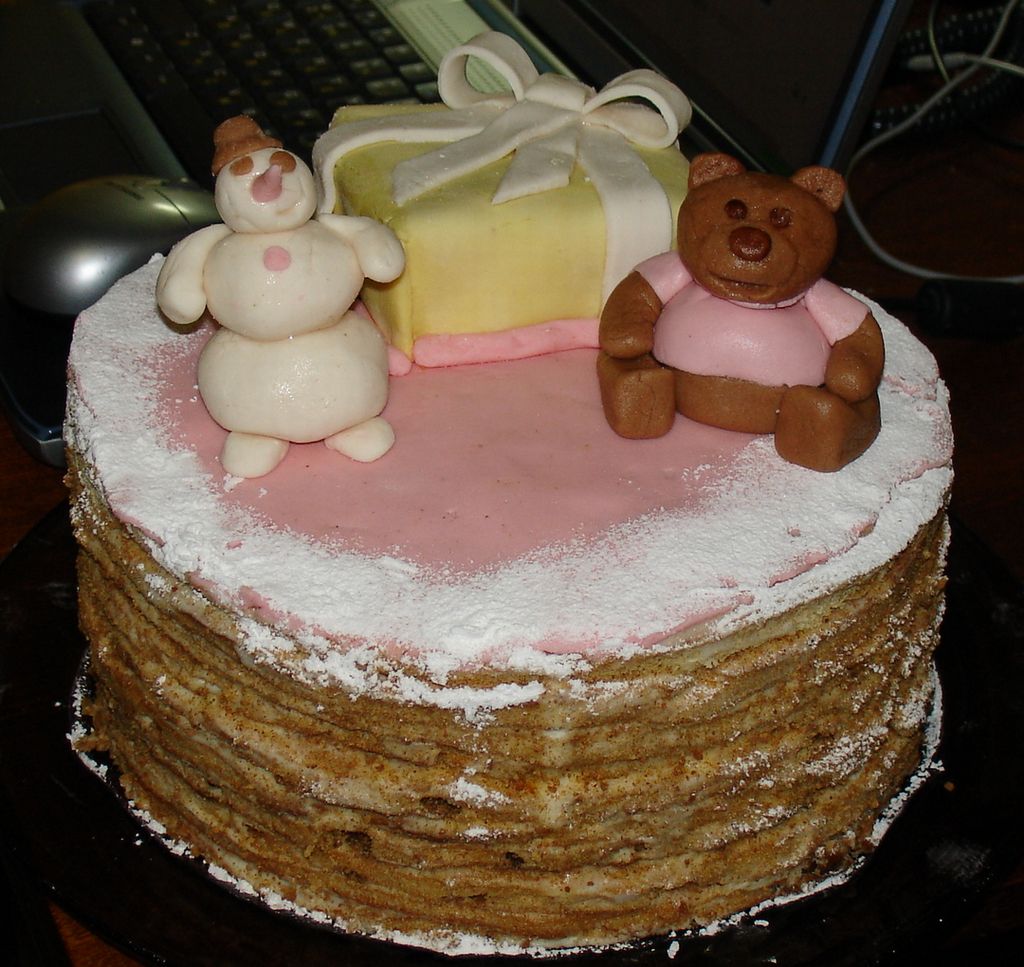 тортик медовый, подарок наверху - из бисквита, обернутый мастикой. снеговик и медвежонок (винни пух, если непонятно) - из мастики, гости даже не подумали, что это самодельные. думали - купила игрушки и просто посадила на торт. т.к. у меня получилась мастика суховата - я обмазала маслом фигурки, чтобы блестели гламурно. ![]()