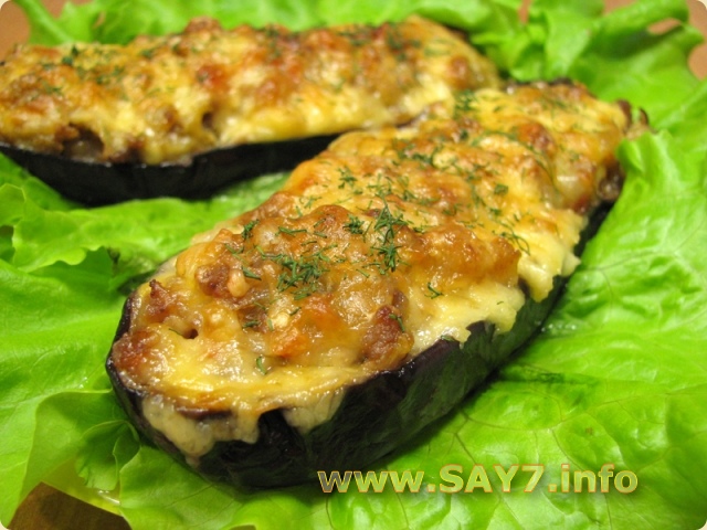 500 г баклажанов 300 г фарша (любого, по вкусу) 250 г помидоров 150 г лука 100 г сыра (твердого) 3 зубчика чеснока растительное масло соль перец Баклажаны вымыть, разрезать вдоль на две половинки. Из каждой половинки вынуть мякоть.Получившиеся половинки посолить и оставить на 30 минут. Затем промыть в холодной воде (это делается для того, чтобы они не горчили).Мякоть положить в холодную воду на 30 минут (для того, чтобы баклажаны не горчили и во время жарки впитывали меньше масла).Лук и чеснок мелко покрошить.Мякоть (после того, как она полежала в холодной воде) отжать и мелко нарезать.Помидоры нарезать небольшими кубиками. Лук и чеснок обжарить на растительном масле. Добавить фарш и хорошо его обжарить (около 10 минут, на среднем огне. Добавить помидоры и мякоть баклажанов, посолить, поперчить и жарить до готовности (около 8-10 минут).Половинки баклажанов наполнить фаршем.Выложить в форму для запекания.Сыр натереть на мелкой терке. Посыпать баклажаны сыром, поставить в духовку. Запекать при температуре 180 градусов в течение 30-35 минут. Готовые баклажаны посыпать зеленью. Очень вкусно, просто и красиво! Вложение: фото правда не мое, но у меня также получилось