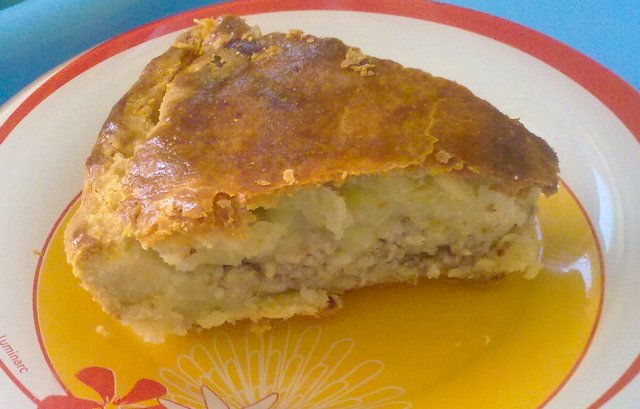 Продукты: мука – 3 стакана маргарин – 250 гр разрыхлитель – 2 ч.л. соль – 1 ч.л. полная кефир, сыворотка (у кого что есть) – примерно 1 стакан или чуть больше Для начинки: фарш – 0,5 кг лук репчатый – 1 шт картофель – 4 шт соль, перец чеснок – 2 зубчика растительное масло для жарки Фарш можно заменить рыбкой- семгой или форелью - в этом варианте пекли тоже оч вкусно) Замесим тесто. Для этого муку просеем в большую миску, добавим соль, разрыхлитель и хорошенько перемешаем. Замороженный маргарин натрем на крупной терке и разотрем вместе с мукой. Постепенно вливаем кефир или сыворотку (у меня были остатки ряженки и скисшееся молоко). Тесто должно получиться мягким и липким. Скатаем в шар и отправим в холодильник минут на 20-30, а сами займемся начинкой. Для начинки фарш обжарим на растительном масле на сковороде. Посолим, поперчим. Лук репчатый мелко нарежем, добавим к фаршу. Когда лук будет почти готов, добавим измельченный чеснок. Остудим фарш. Картошку сварить и растолочь в пюре но без молока - со слив. маслом, Теперь берем форму, смажем ее растительным маслом и присыпем сверху мукой. Тесто достаем из холодильника и поделим его на две части, большую из которых нужно раскатать. Укладываем в форму, оставляем края для защипывания. Выложим сверху на тесто фарш и картофель. Раскатаем вторую часть теста и накроем наш пирог сверху. Тщательно защипаем края. Сверху пирог смажем взбитым желтком. В духовку 200 градусов на 1 час примерно. смотрим по верху- он будет очень румяный)