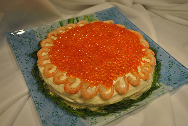 Вложение: Блины: 1 яйцо, 6 столовых ложек муки, 150 грамм молока, 150 грамм воды, 1 ложка растительного масла, соль. Ингридиенты: креветки, сыр плавленный, семга, красная икра, огурец свежий (можно соленый или авокадо), сливочное масло, зеленый лук, зелень. Способ приготовления: Жарим обычные блинчики. Затем делаем блинный торт, каждый блин смазываем определенной начинкой. Первый блин смазываем плавленным сыром, второй выкладываем слабосоленую семгу, третий - порезанный кружочками огурчик, четвертый - креветки отваренные и очищенные, пятый - мягкое сливочное масло перемешанное с зеленью и зеленым луком. Затем закрываем все 6 блином, смазываем весь торт плавленным сыром и украшаем! |