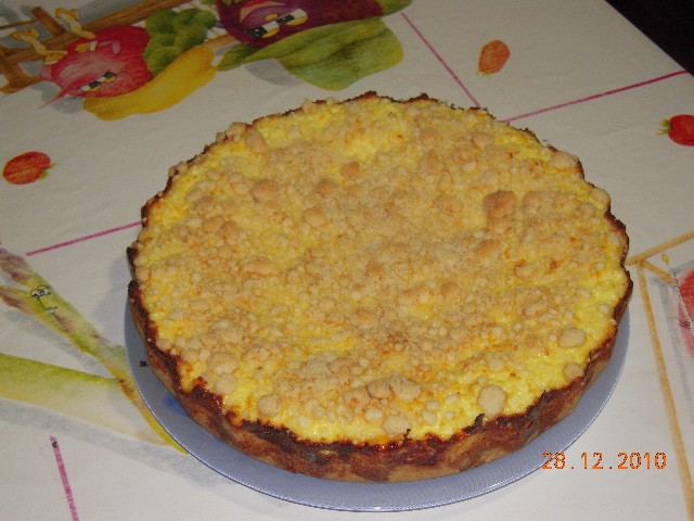 Для теста: 100г маргарина 0,5 стакана сахара 0,5кг муки 0,5 ч.л. соды, гашенной уксусом Для начинки: 400г творога 5 яиц немного сахара Приготовление: Соединить все ингредиенты для теста, растереть, замесить тесто, отделить небольшой кусок теста и положить его в холодильник. Соединить творог с сахаром, вбить яйца, перемешать, затем взбить миксером. Тесто распределить по смазанной форме, сделать бортики, вылить начинку. Сверху натереть на мелкой терке охлажденный кусочек теста. Запекать 30 минут в разогретой духовке