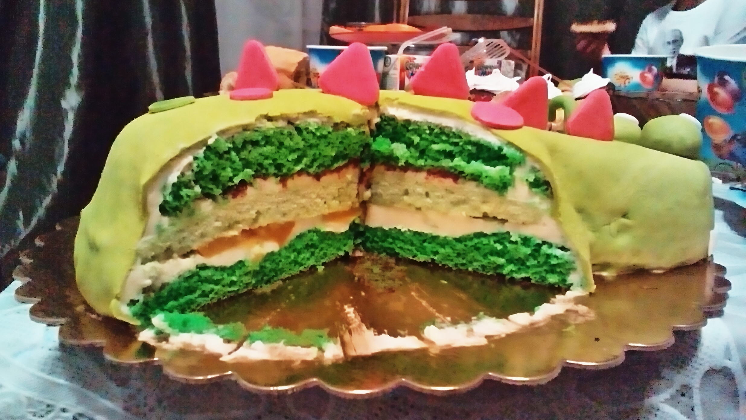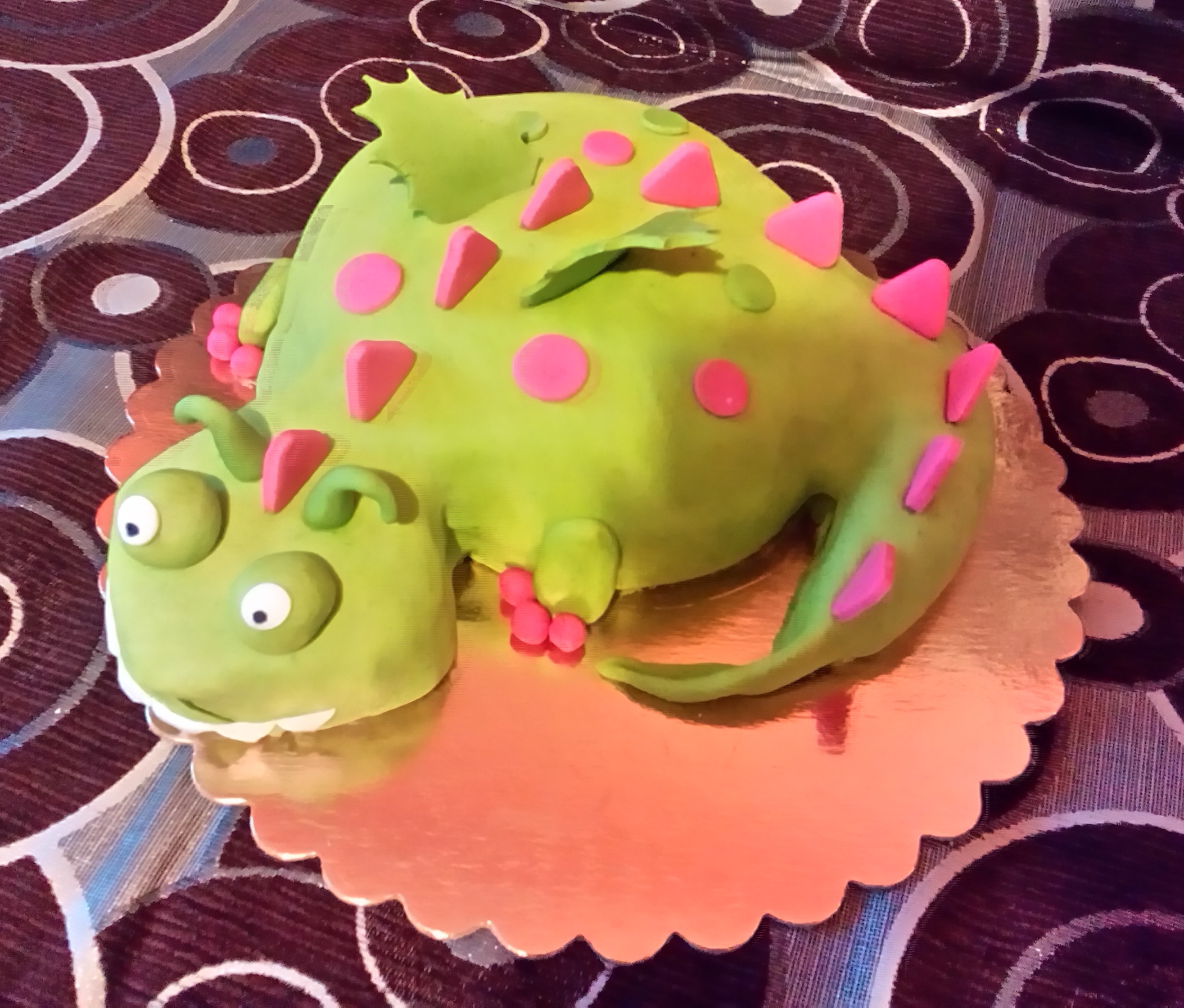 Тортик на день рождения сына. Просил торт- дракон, но получился какой- то черепаховый динозавр))) и вместо розового должен был быть красный цвет- ну да ладно)))
