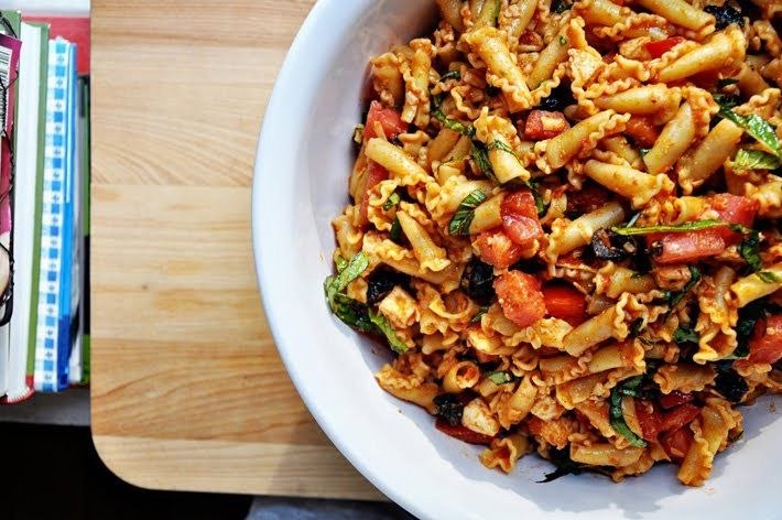 Макаронный салат с моцареллой, сушеными помидорами и оливками Ингредиенты: Оливковое масло – 6 столовых ложек Сушеные помидоры из упаковки (масло слить) – 100 г Винный уксус – 2 столовых ложки Каперсы – 1 столовая ложка Чеснок – 1 зубчик Паста «Ракушки» - 500 г Большой спелый красный томат, нарезать Моцарелла – 225 г Базилик свежий – 1 стакан Тертый пармезан – 1 стакан Оливки без косточки, нарезать напополам – ½ стакана Я оливки не люблю, так что без них, каперсы и помидоры есть в премьере или чеховском! Приготовление: В блендере взбейте оливковое масло, помидоры,уксус, каперсы и чеснок. Все должно быть мелко смолото. Отварите пасту аль денте в подсоленной воде. Слейте и выложите в большую миску. Перемешайте с приготовленным соусом. Остудите и продолжайте периодически помешивать. В остывший салат добавьте нарезанный свежий помидор, моцареллу кусочками, базилик, тертый пармезан и оливки. Перемешайте. По вкусу добавьте соли и перца.