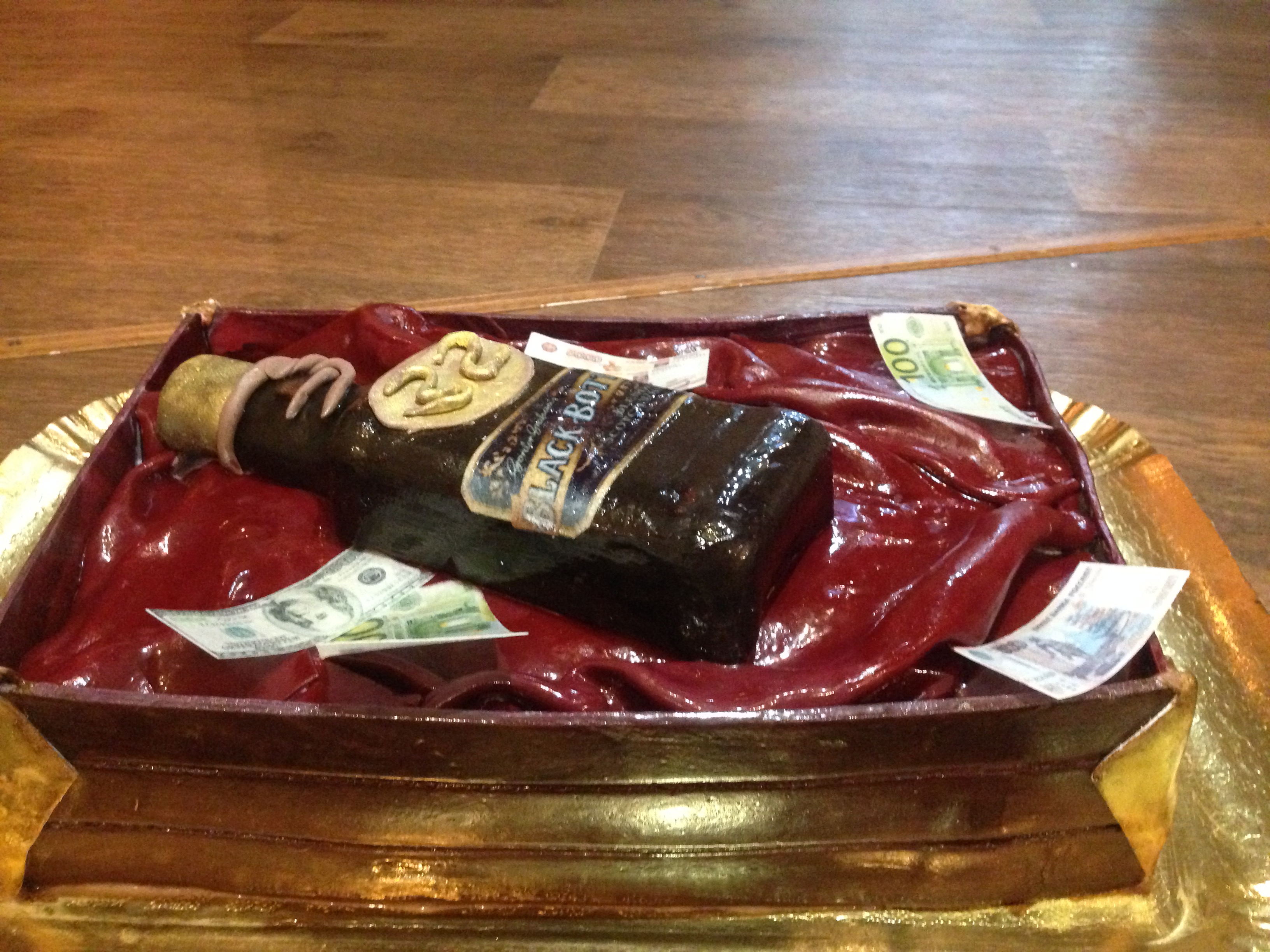 вот мой хваст. Торт бутылка в коробке. Короб из двух цветов мастики смешала. Сверку губкой покрасила водка с коричневой краской. мастику для бутылки оставила на 5часов сохнуть. этикетку в красивом подходе заказала, деньги тоже. сверху гелем промазала. коржи из размешайки - кексы. добавила мак туда и орехи, пропитала сиропом. персики впрослойке. крем заварной с вареной сгущенкой. получилось вкусно . все довольны. вес 5 кг