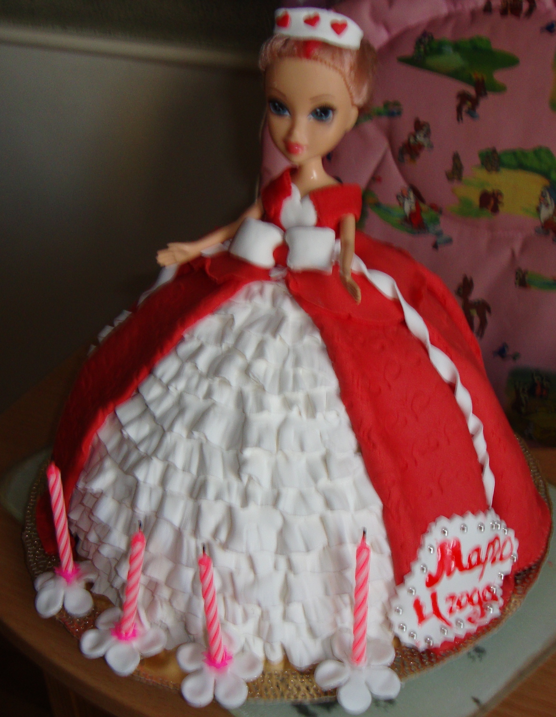 не сфотографировала сзади, все времени не было, успела щелкнуть перед тем как резать начали. вот немного сбоку вид Вложение: сзади просто складками платье сделано. Я частями юбку делала, каждую часть внахлест крепила подгибая края и изгибая посередине, получились складки. Покупная ведет себя прекрасно. Красная у меня давно лежала и стала жесткой, я ее в микроволновке подогрела, но она стала быстро сохнуть, и прям трескаться на изгибах платья, еле еле обтянул торт. А вот белая свежая, одно удовольствие с ней работать. Я даже ни крахмал, ни чего не добавляла, она и так не липла никуда. |