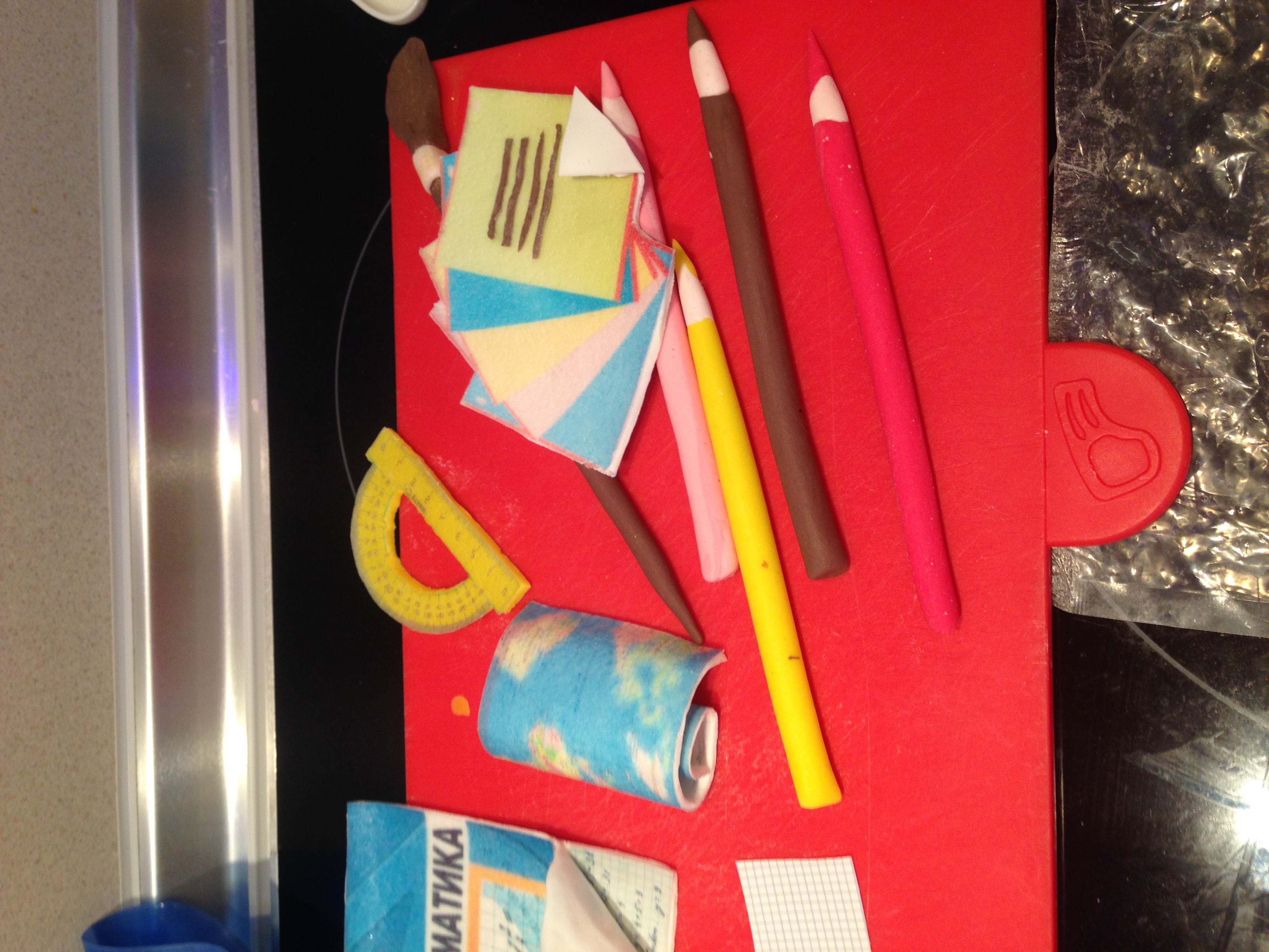 olgarezh писал(а): : 9.06.2016 7:19 арина арина как сделаны тетради, карандаши и карта? Все фотопечать , наклеенная на мастику. отдельно распечатала фрагмент листика в клетку и примеры по мат-ке. А карту наклеила на мастику и свернула в рулон. карандаши из мастики, в инете научилась. Что бы аккуратно было, надо раскатывать их не руками , а дощечкой. |