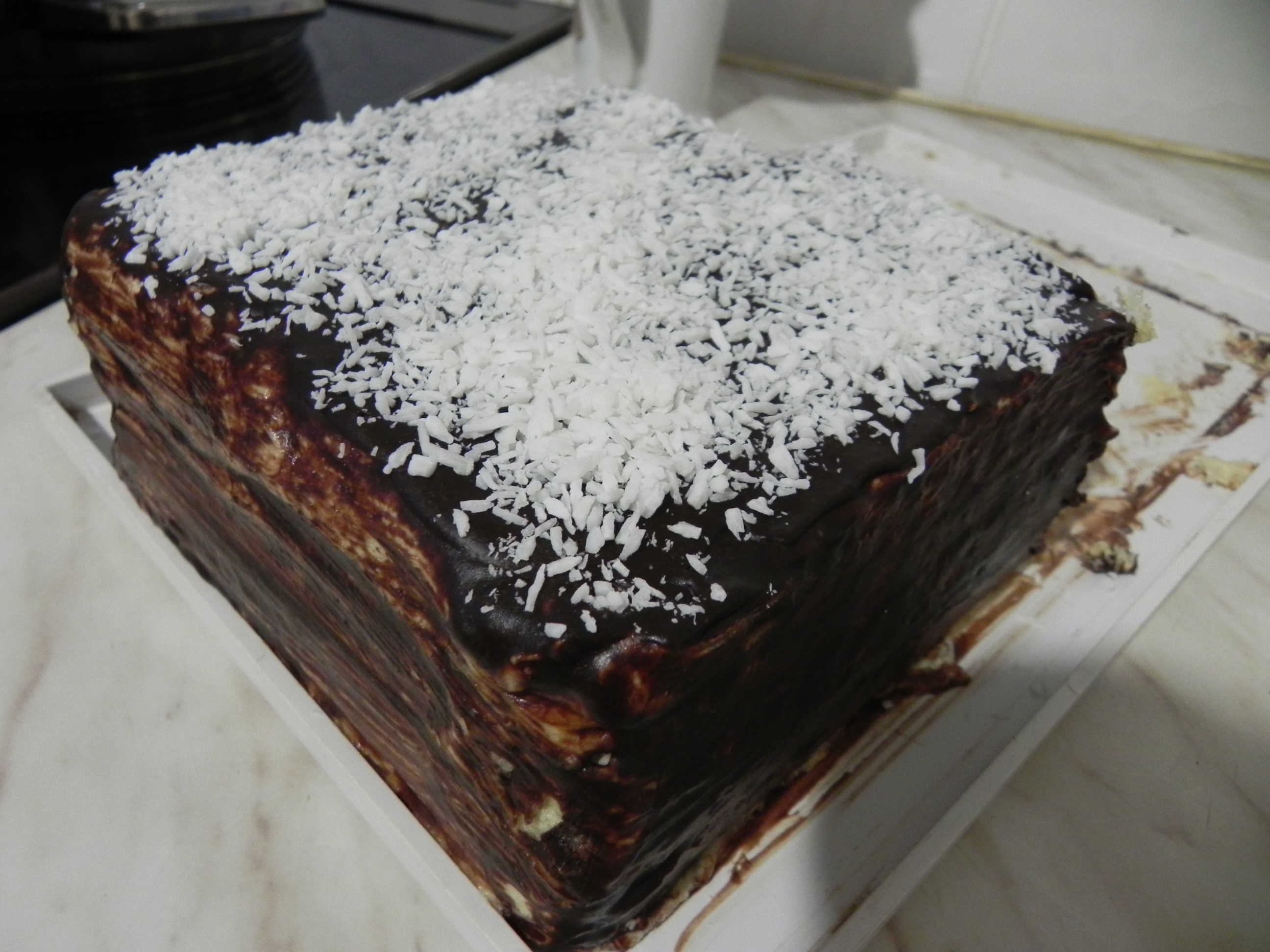 На НГ делала простой вафельный торт, очень уж его любит моя мама и братик ) Купила 3 пачки прямоугольных вафельных коржей, крем: 3 банки сгущёнки сварила и взбила с маслом сливочным, типа глазурь сделала так: растопила шоколадку 100 гр в сливках около 150 мл на водяной бане, сверху посыпала кокосовой стружкой