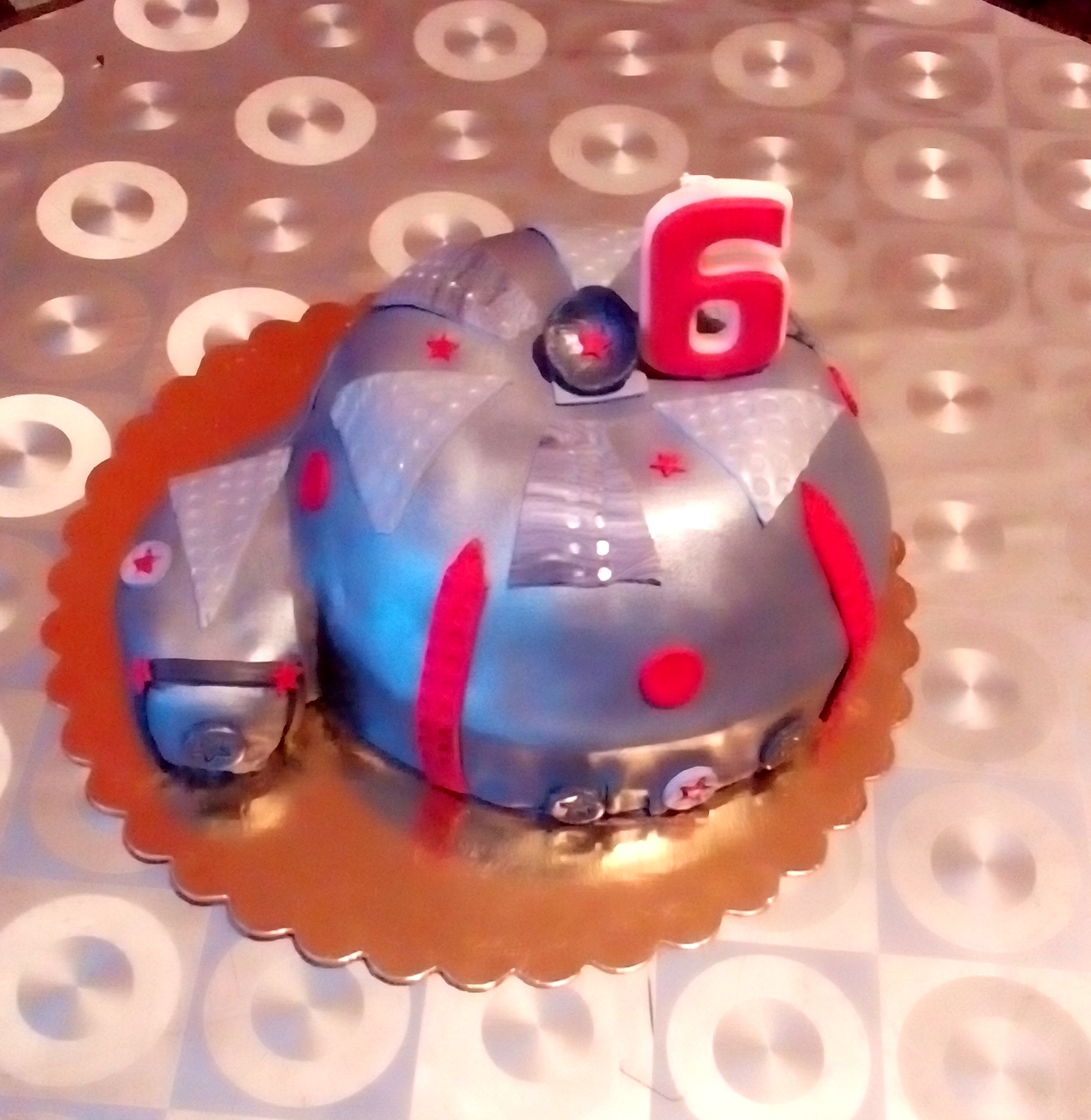 Брала белую мастику и черный краситель. Черный то цвет получается, а вот при малом добавлении почему- то фиолетовый На фото не очень виден уже фиолетовый цвет Сверху губкой наносила серебряный краситель Внутри шоколад на кипятке, крем с вареной сгущенкой и много грецких орехов ( по запросу сына )